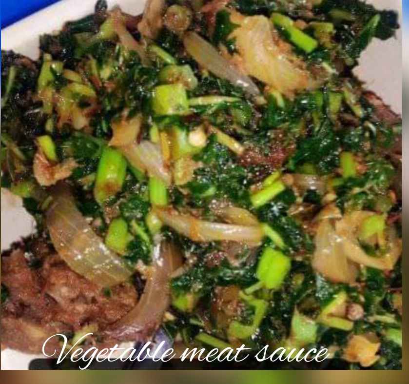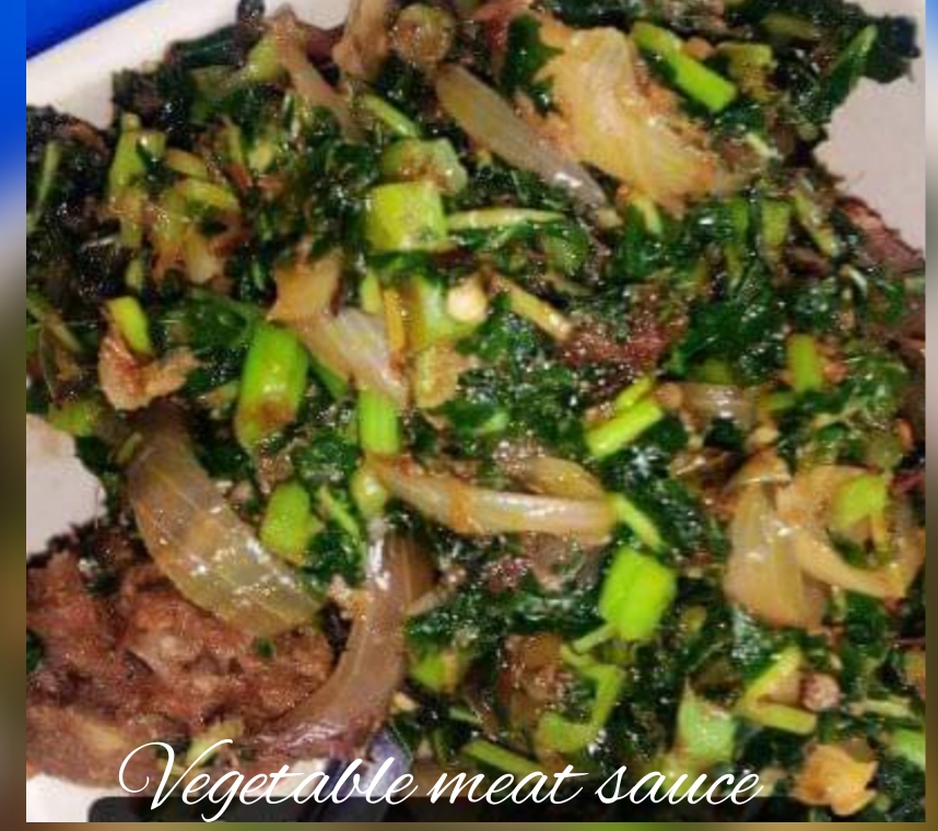 Note: Do not put salt in vegetables meat sauce.the salt you put in meat when cooking is enough. Do not cover the pot while preparing the vegetables meat sauce